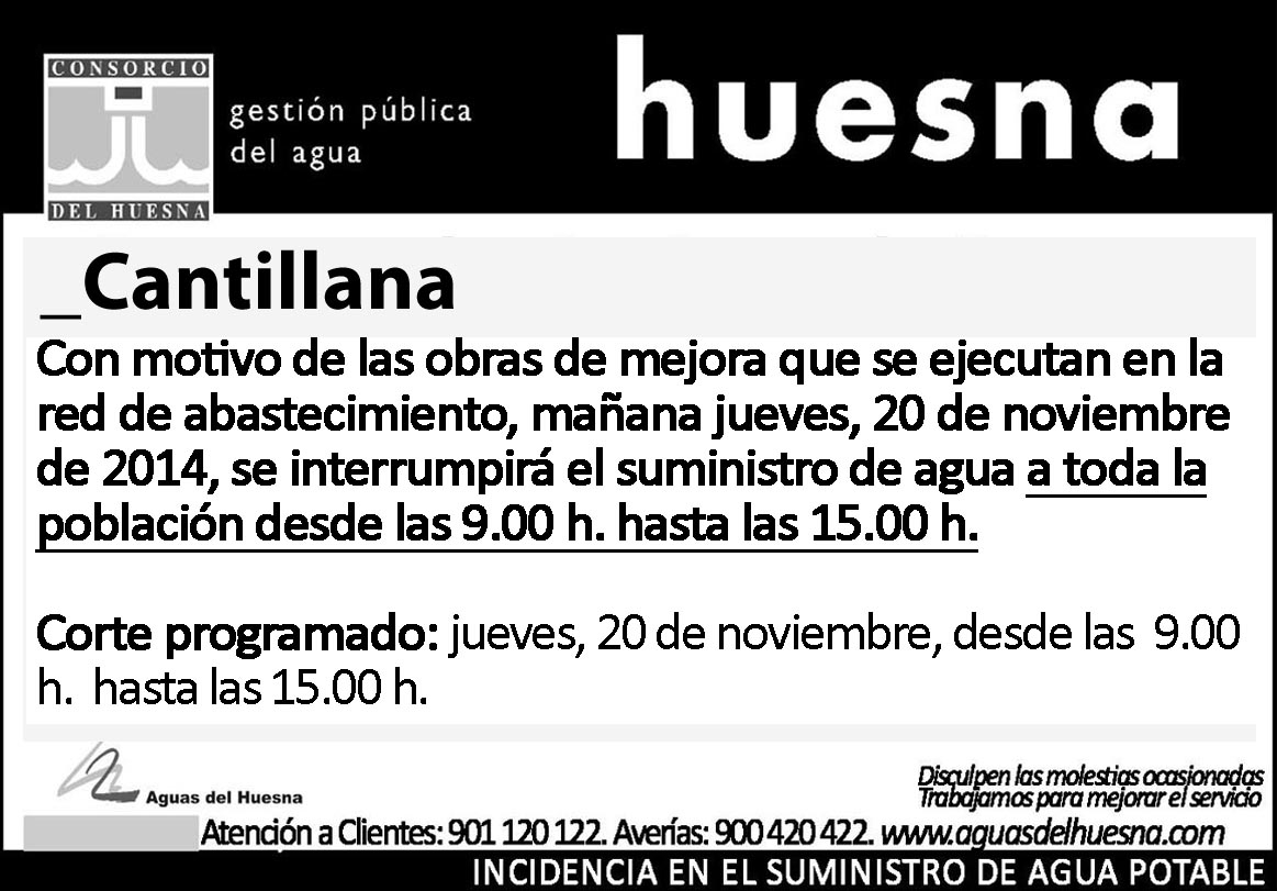 Por obras de mejora en la red de abastecimiento “Aguas del Huesna” informa que realizará un corte programado de toda la población el jueves 20 de noviembre desde las 9:00 hasta las 15:00 horas.